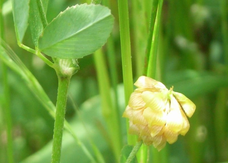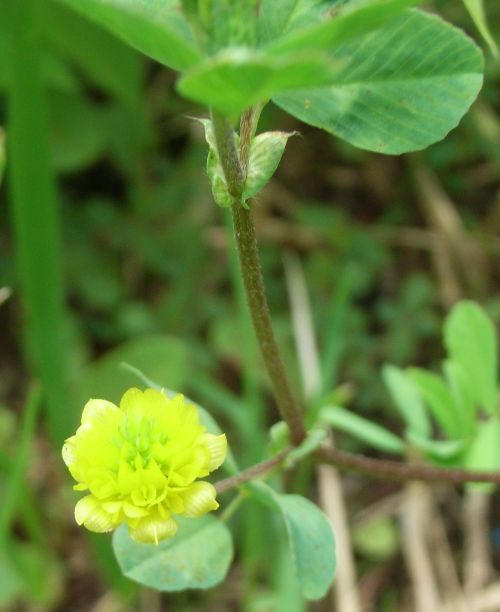 黄色で長さ3〜4ミリの蝶形花が20〜30個頭状に集まってつく。