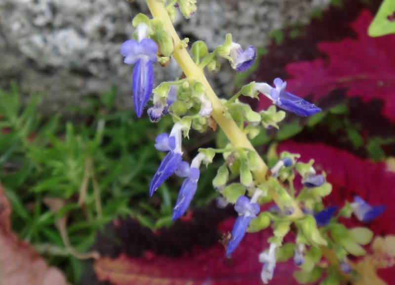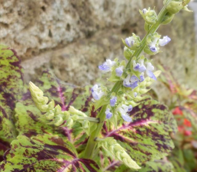 夏〜秋に茎の先から数本の穂状花序をのばしてシソのような花をつけるが、