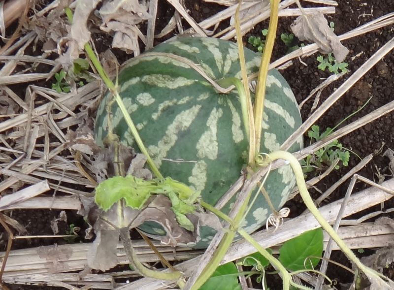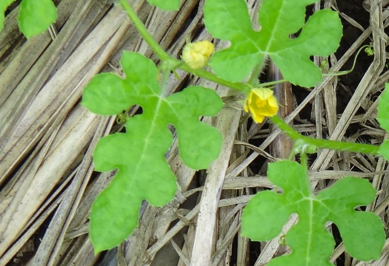 雌雄異花で、葉腋に先の5裂した黄色い花が咲く。