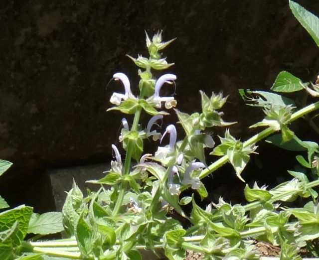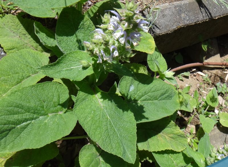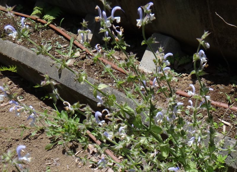 枝先の穂状花序に、淡紫色〜白色で直径1〜2センチの唇形花をつける。