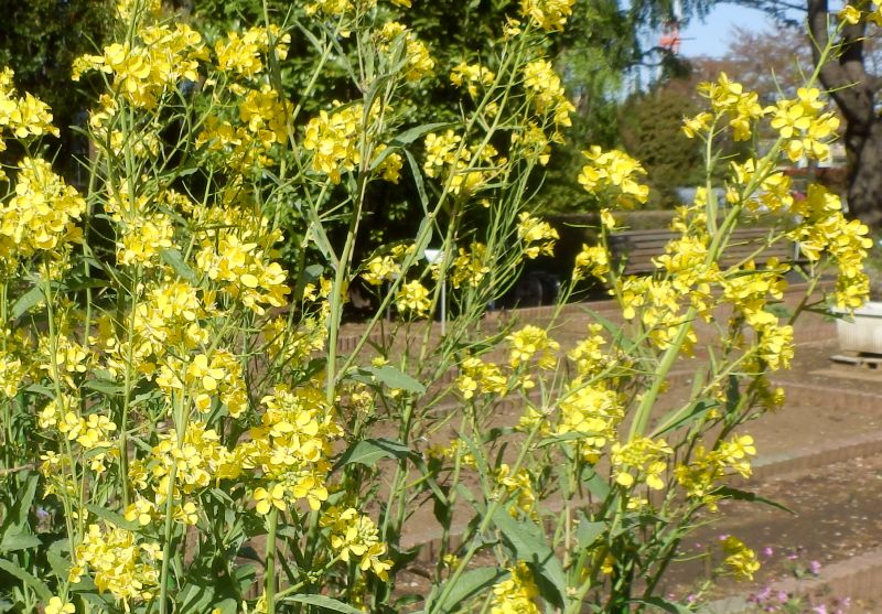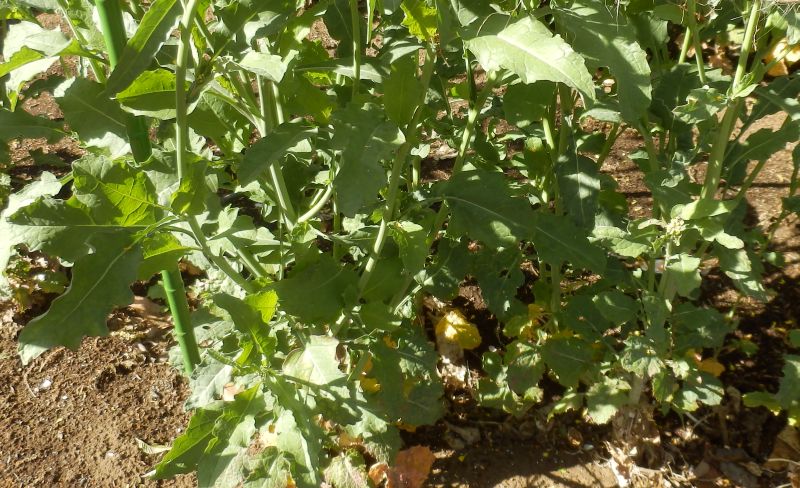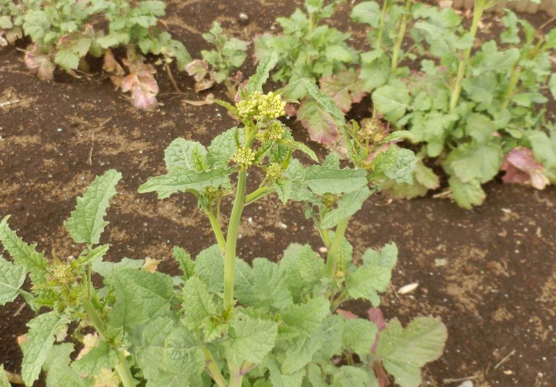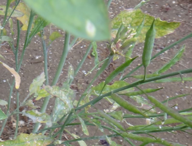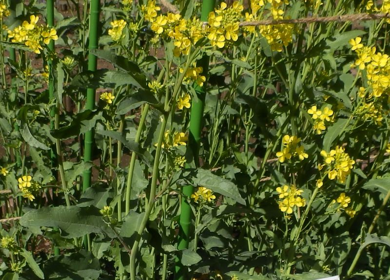カラシナ :葉は茎を抱かず、鋸歯があり、花は小さく、種子は黄褐色。