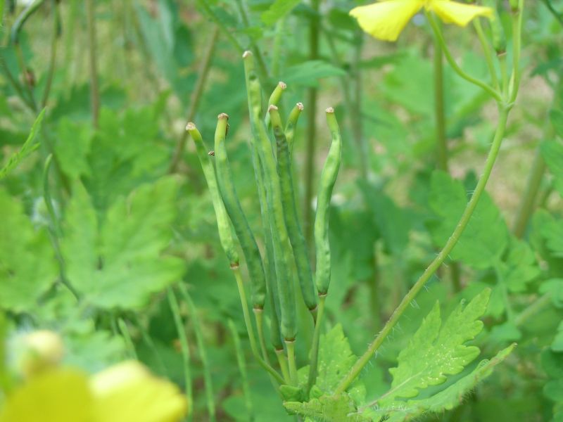 長さ3〜4センチの細長い鞘状の朔果を立てる。中に黒い半球形の種子があり、
