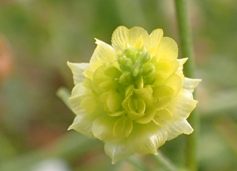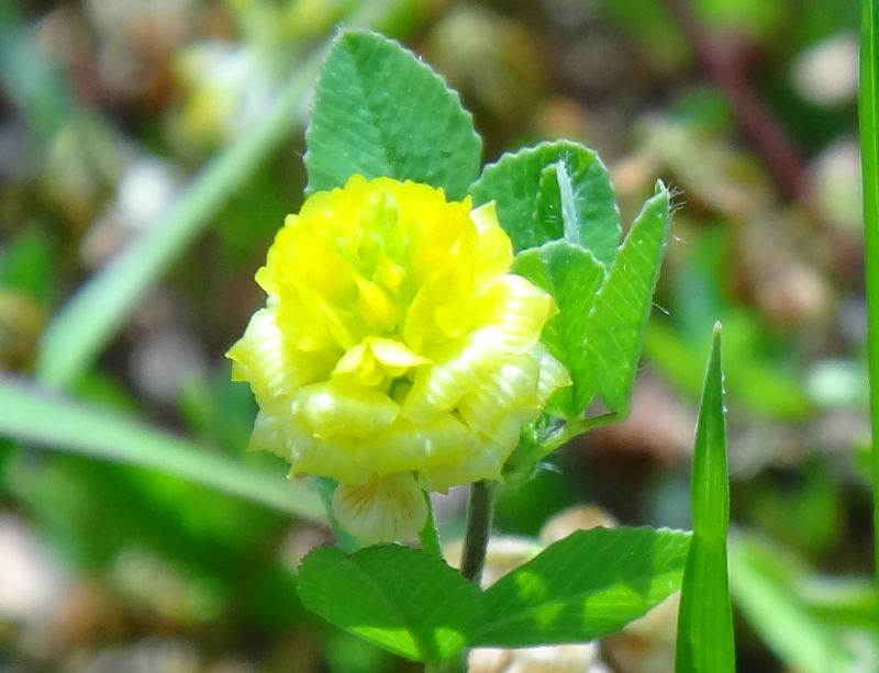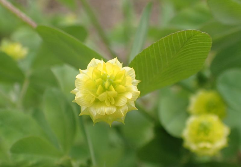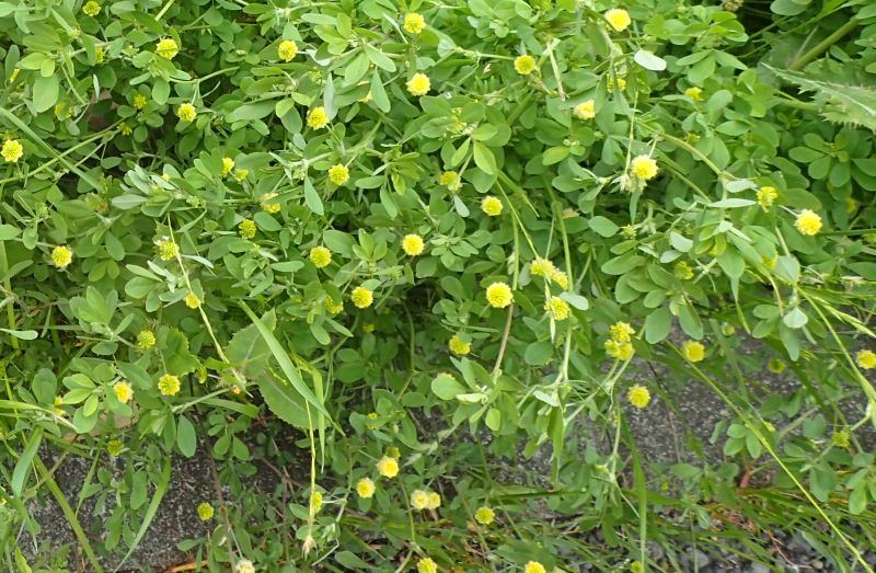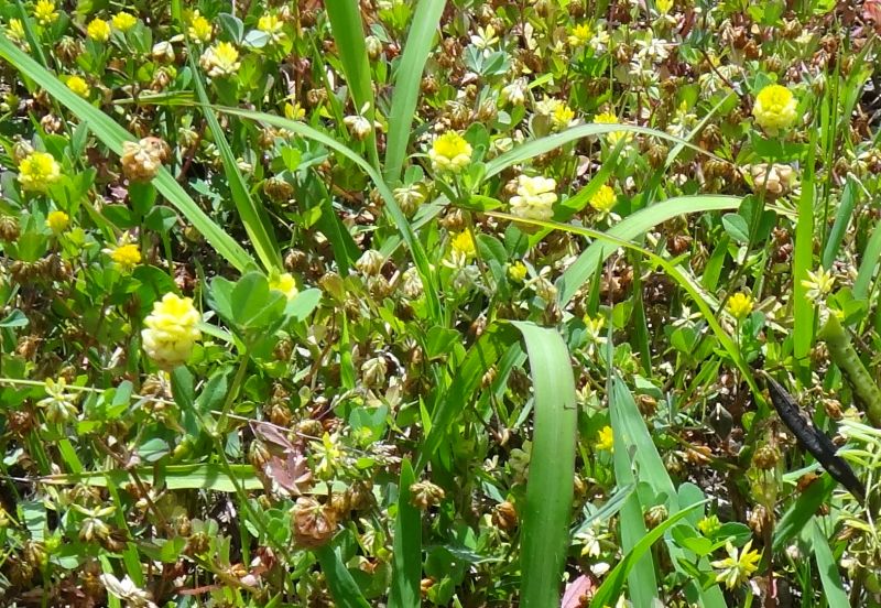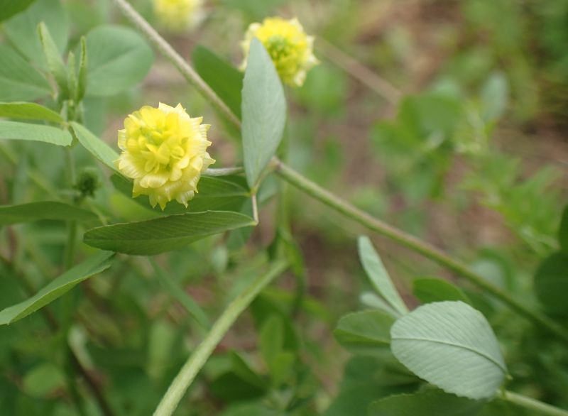 コメツブウマゴヤシ:20〜30個の花が球状に集まる、花柄が高くのびる、葉に白毛、先が半回転した豆果ができる。