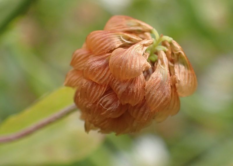 クスダマツメクサ :50〜60個の花がくす玉状に集まる、受粉後下を向いた花の中に種子ができる。