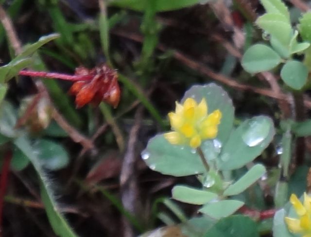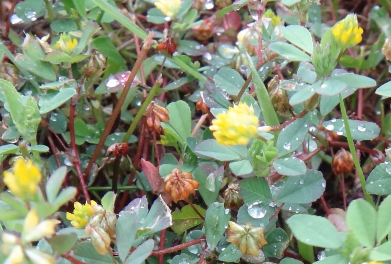 コメツブツメクサ :5〜20個の花が球状に集まる、花柄が短い、葉はほとんど無毛、受粉後下を向いた花の中に種子ができる。