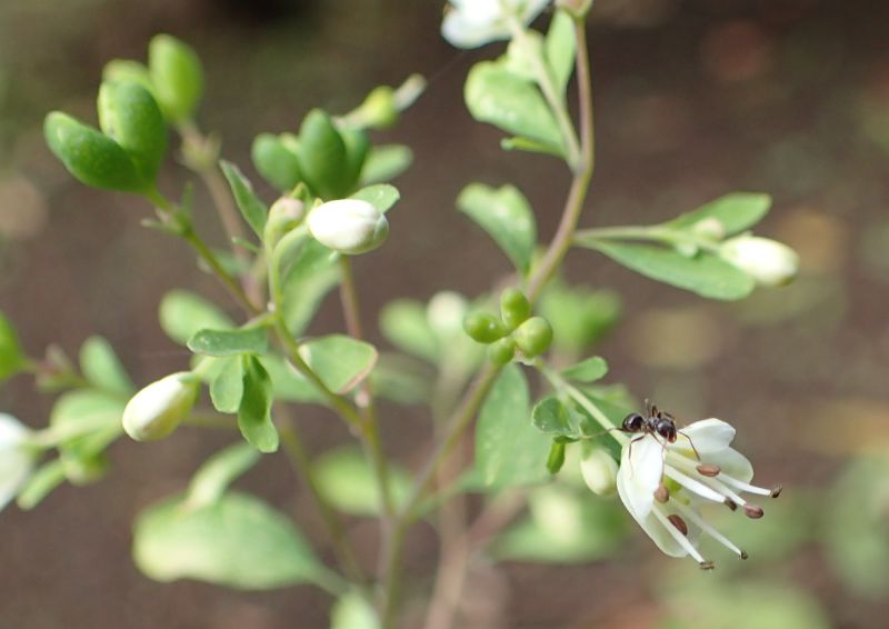 枝先の集散花序に白い小さな4弁花をまばらに多数つける。