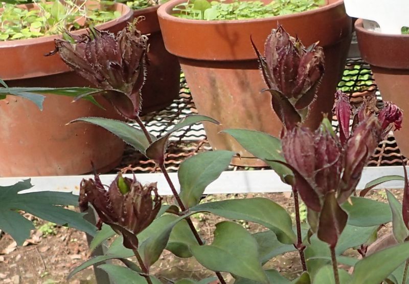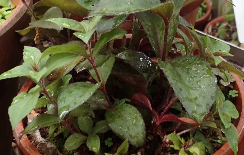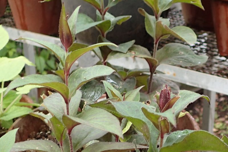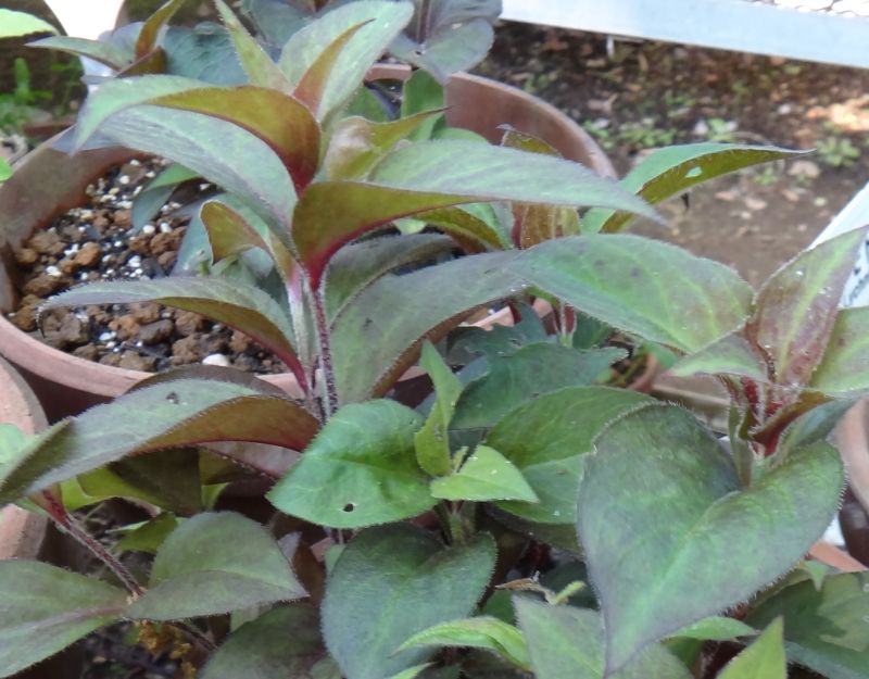 花色の濃い株の茎葉には暗赤紫色を帯びるものもある。