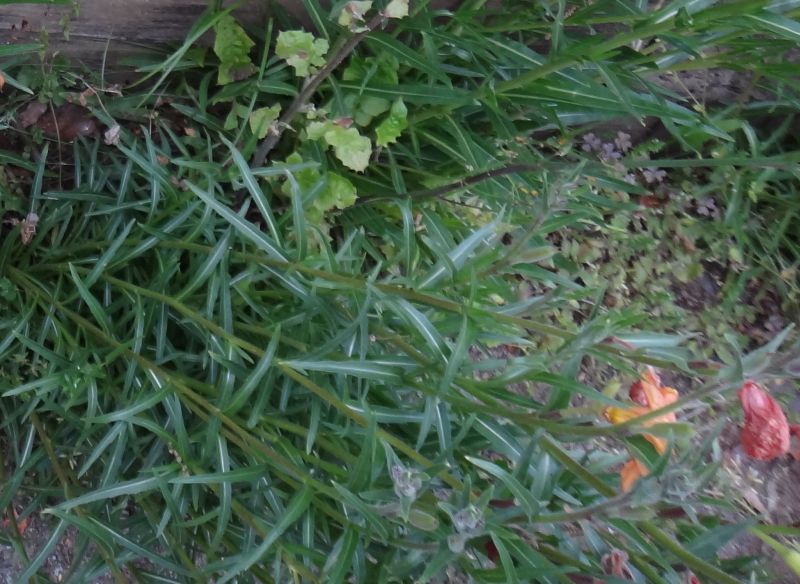 葉は互生し、長さ5〜13センチの線状披針形で、中脈が白く、