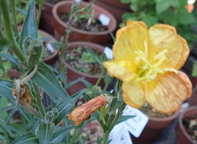 メマツヨイグサ :花径3〜4センチで、しぼむと黄白色、、萼筒やや長く、鋸歯明瞭。