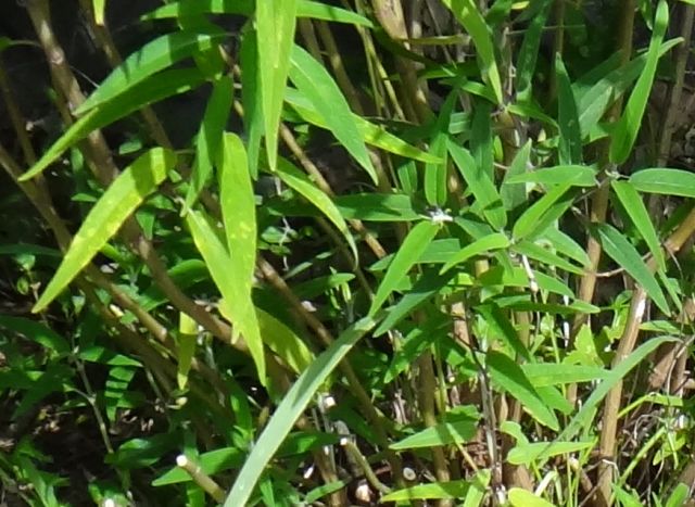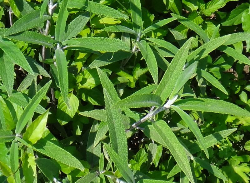 葉はとがった狭楕円形で、厚みがあり、葉脈がへこむ。若い茎に微毛が密生する。(2015/9/20)