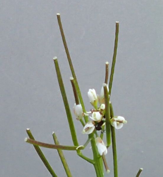 細い棒状の長角果が直立し、中には楕円状の種が1列に並んでいる。
