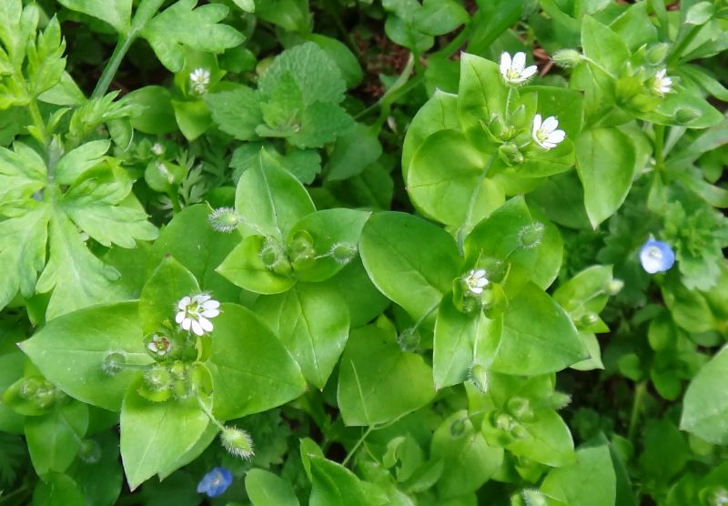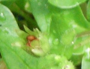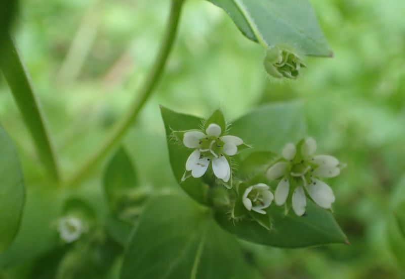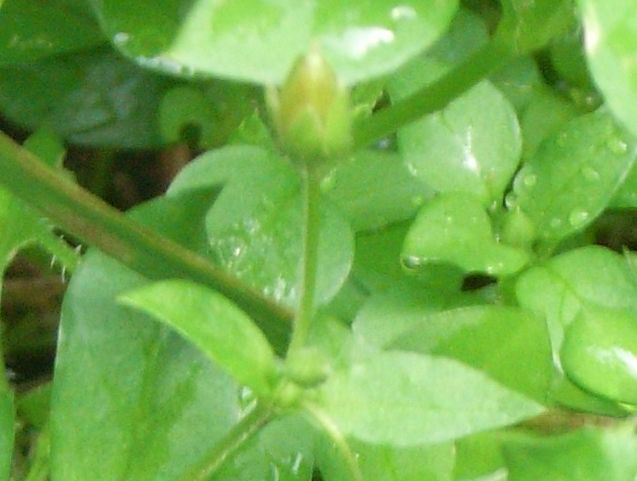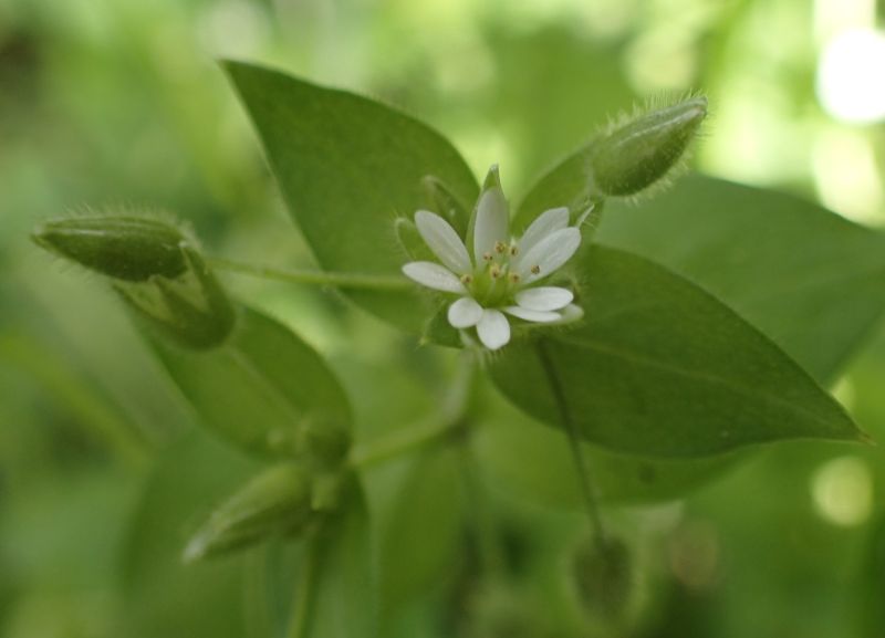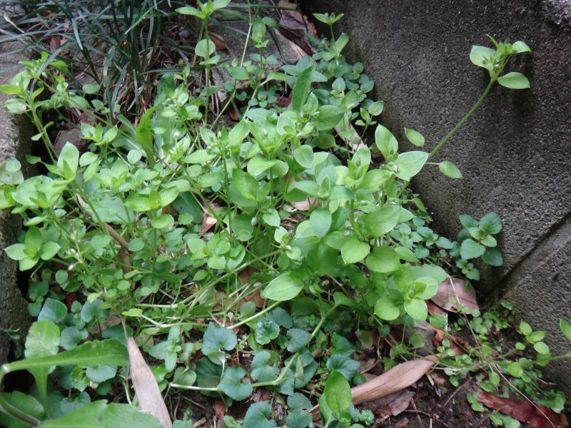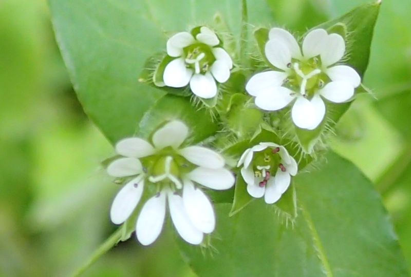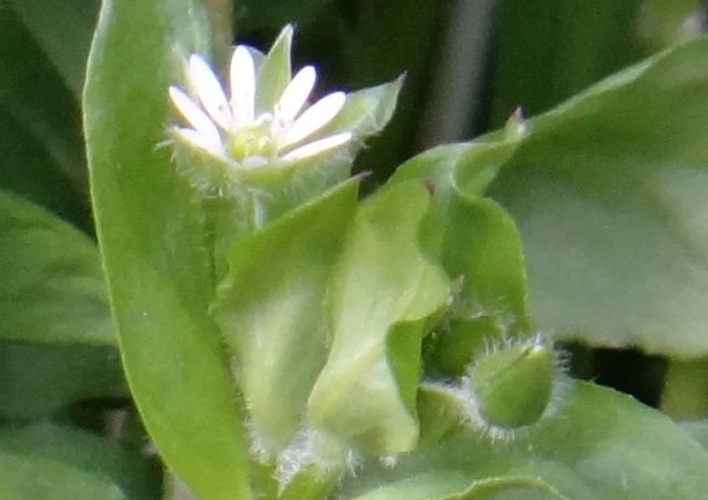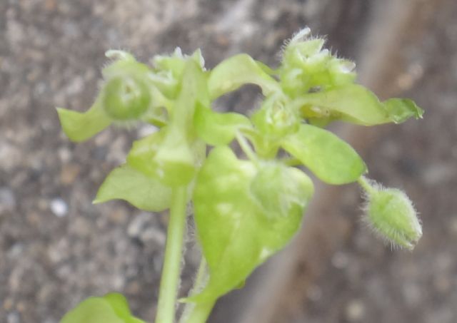 ミドリハコベ:茎が緑色、葉は1〜2センチの卵形、花柱は3個、雄しべ5〜10本、種子に尖った突起密生。