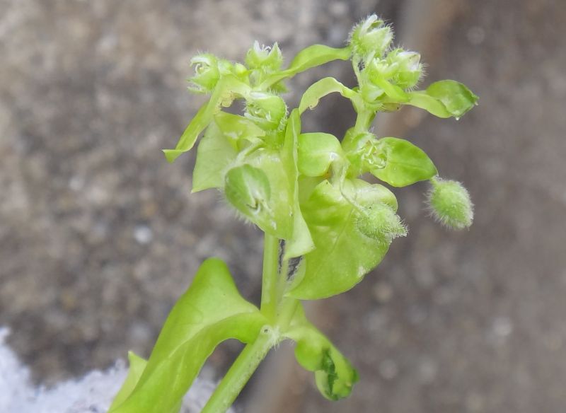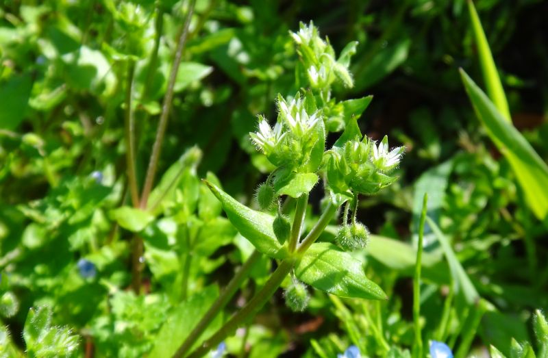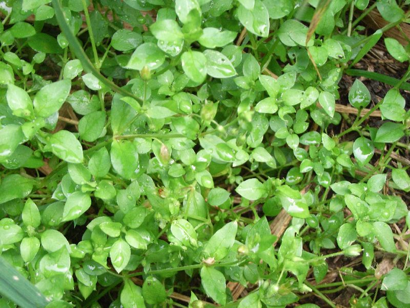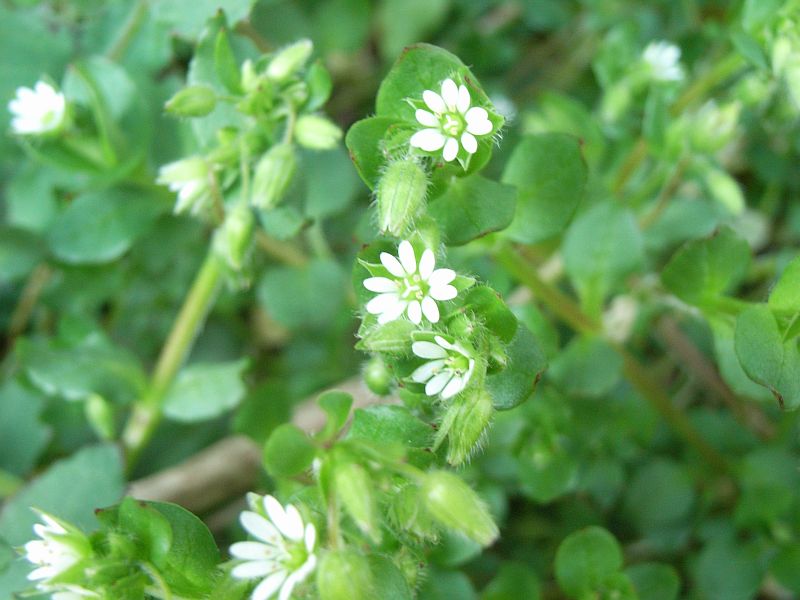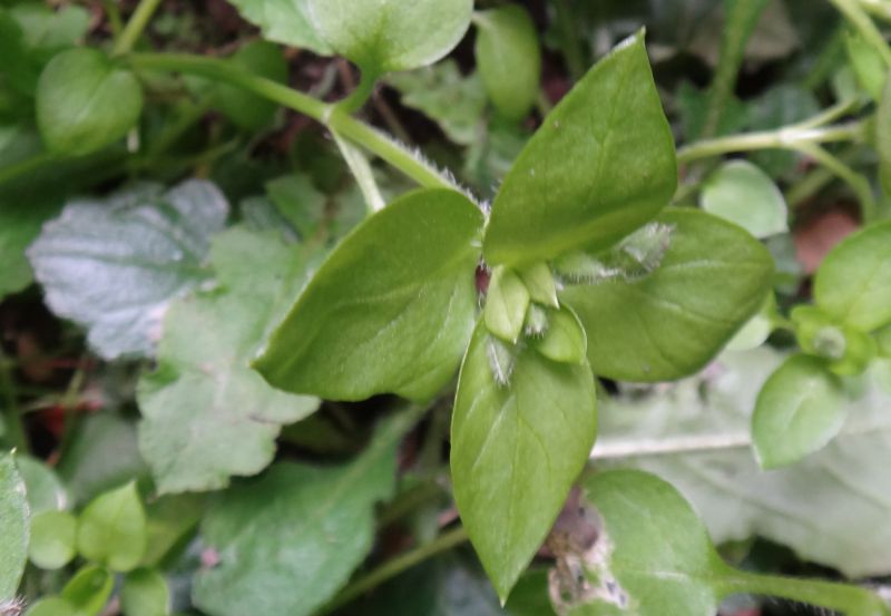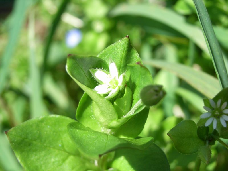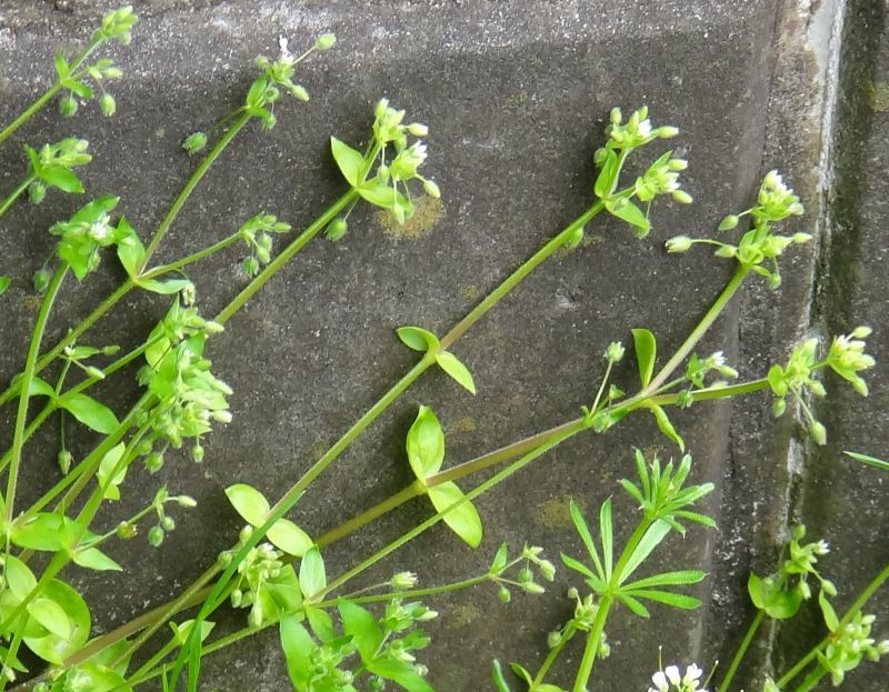ミドリハコベ:茎が緑色、葉は1〜2センチの卵形、花柱は3個、雄しべ5〜10本、種子に尖った突起密生。