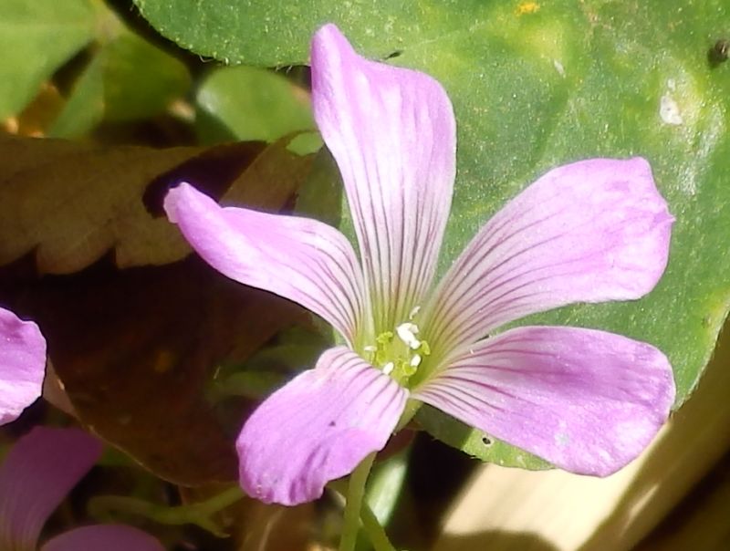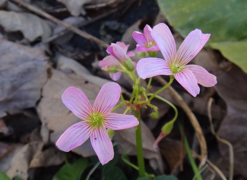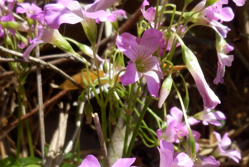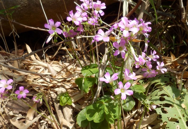 ムラサキカタバミ:花が紅紫色で葯が白い、地中に多数の鱗茎を作って散らばらせる。