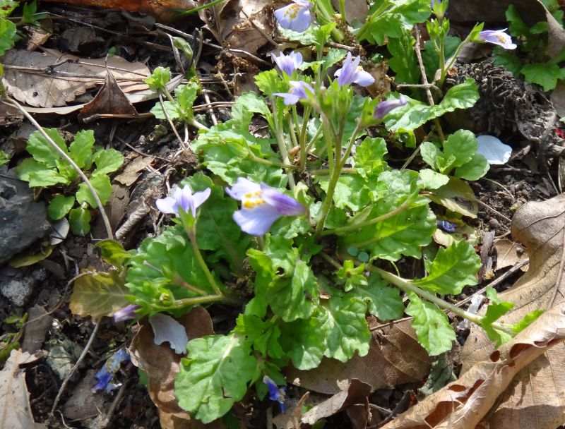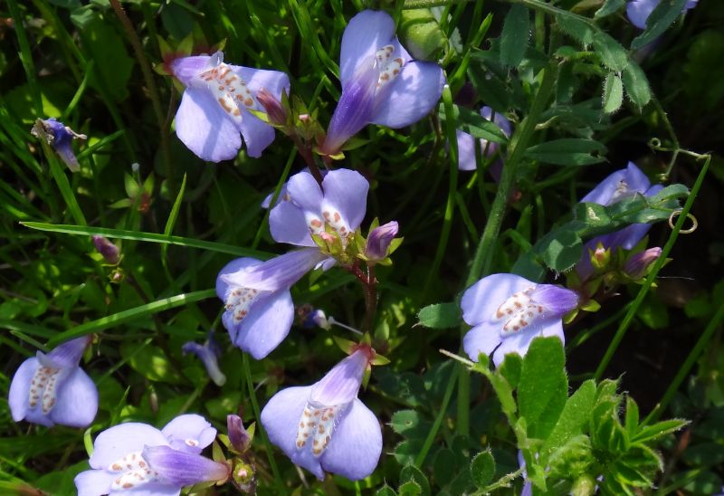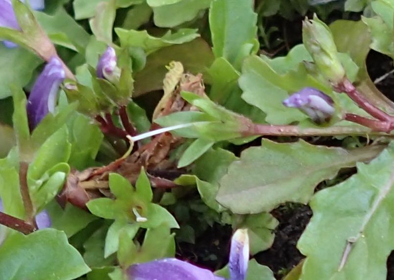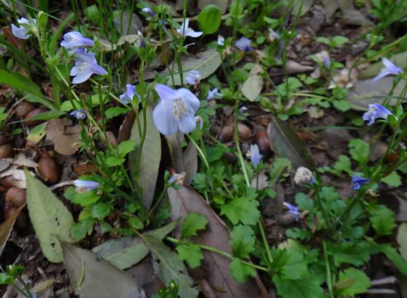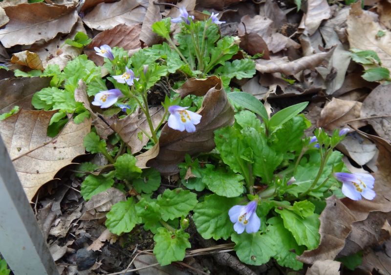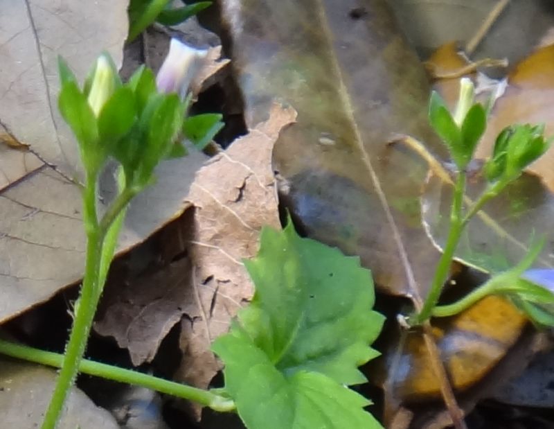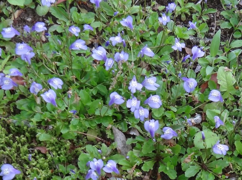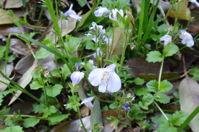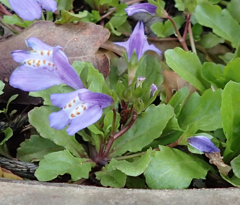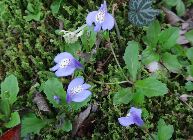 ムラサキサギゴケ:葉は倒卵形、花に黄褐色の斑紋、匐枝を出す、新分類ではハエドクソウ科。