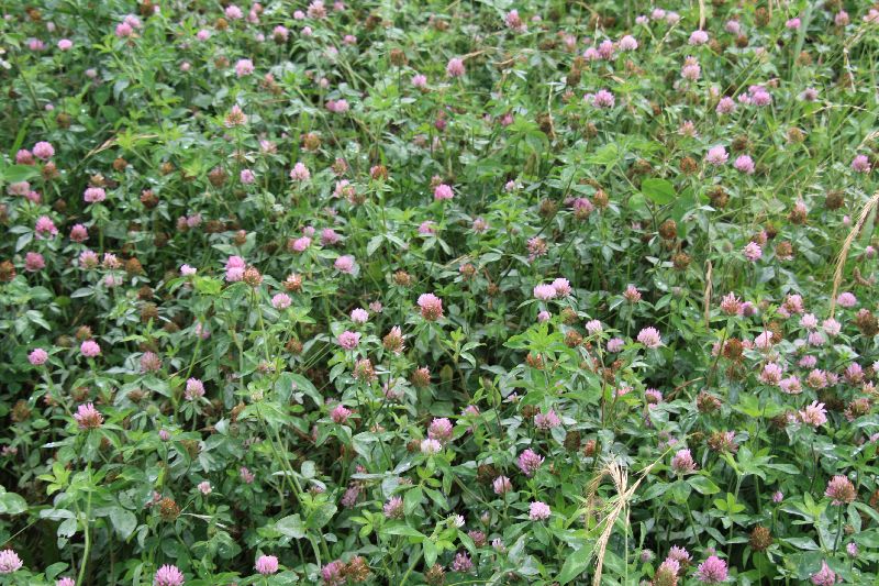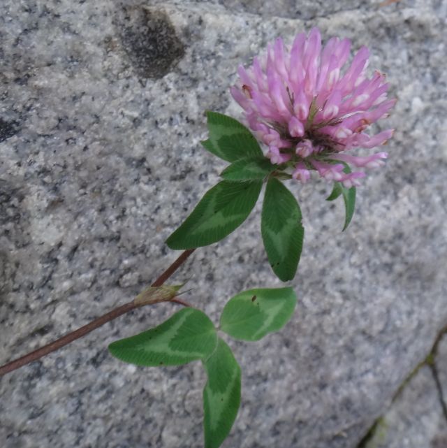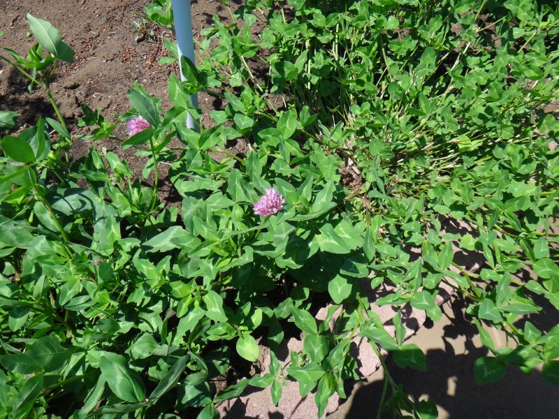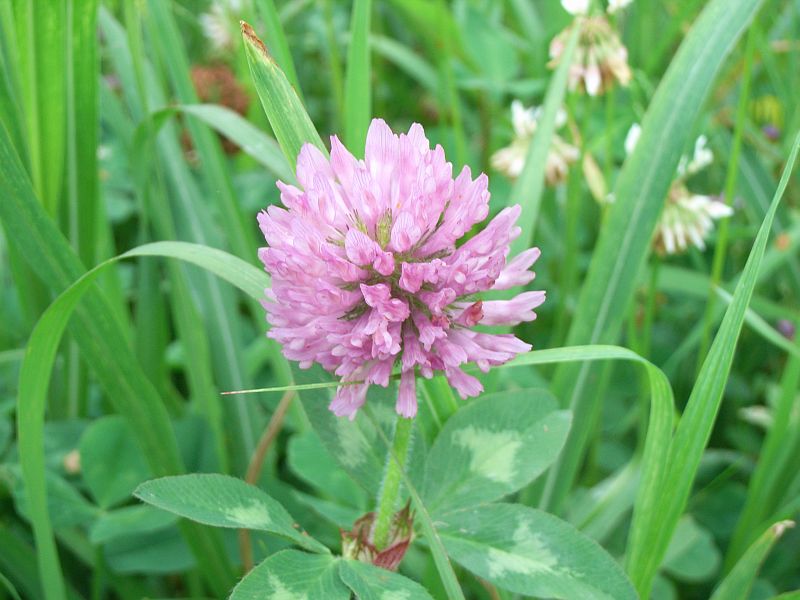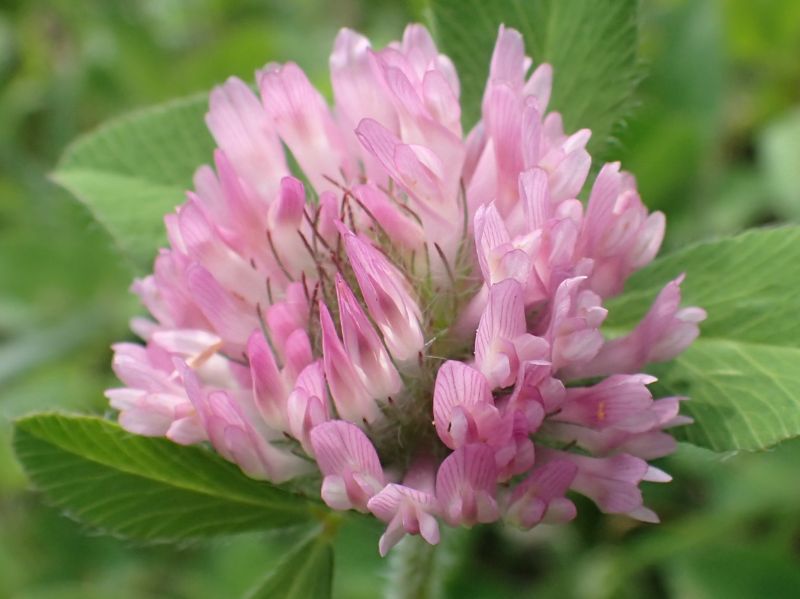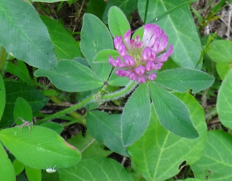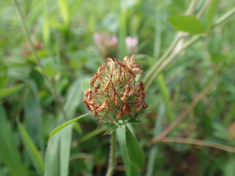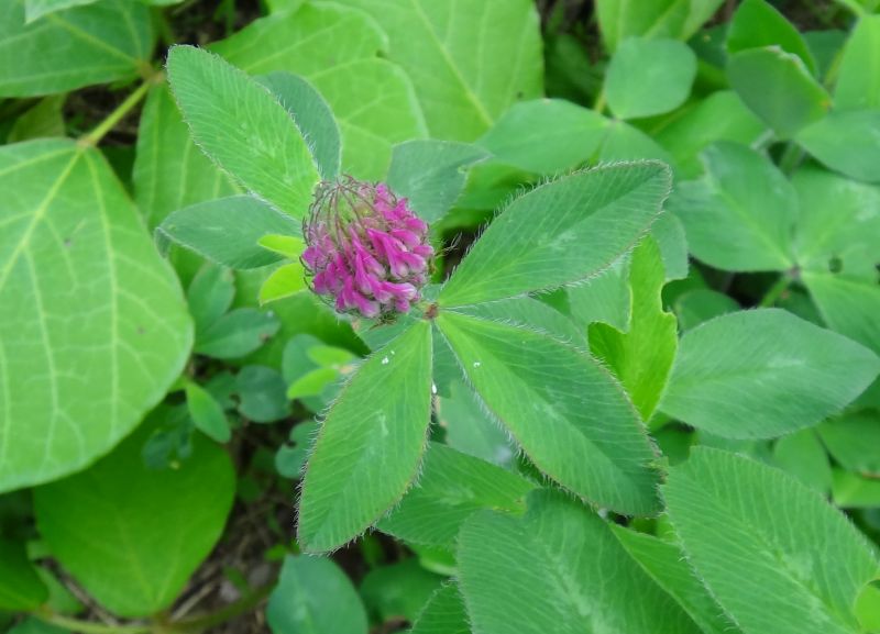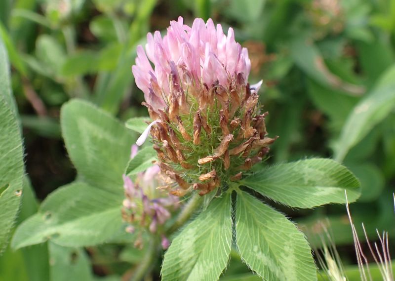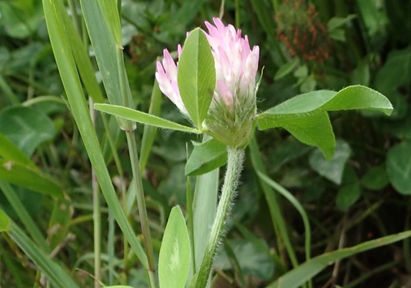 ムラサキツメクサ:花が紫色、受精しても垂れない、立ち上がる、小葉が楕円形、花序の柄が短い。