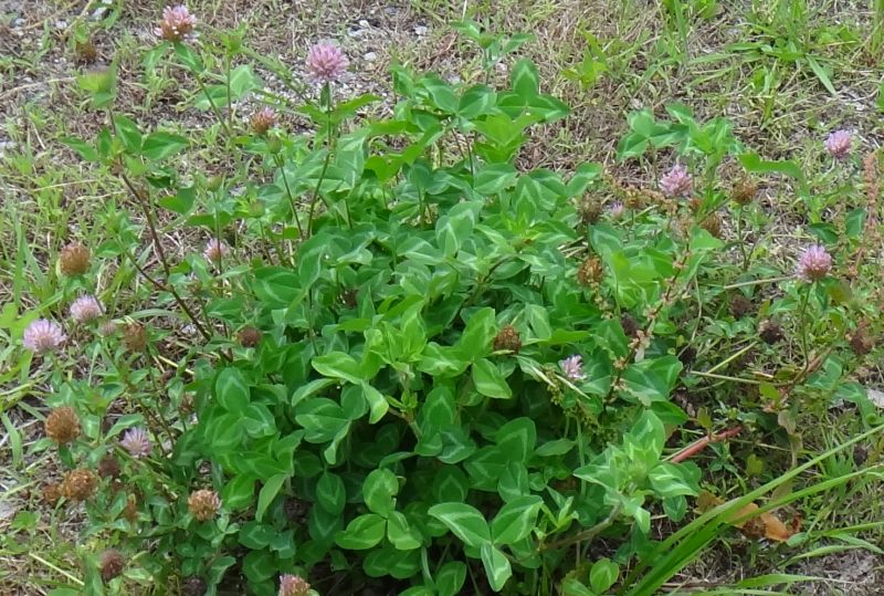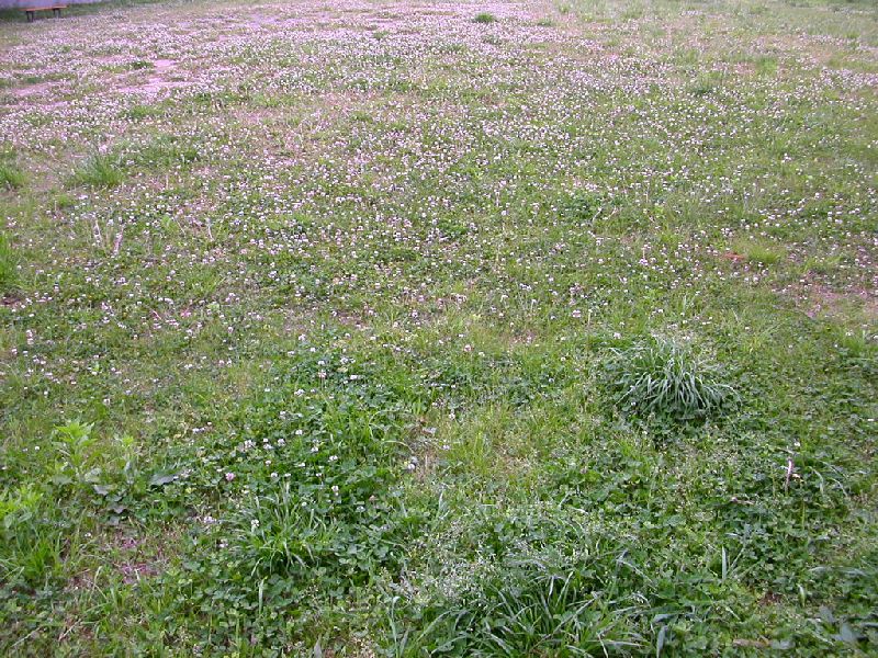 シロツメクサ :花が白い、受精した花は垂れ下がる、横に這う、小葉が丸い、花序の柄が長い。