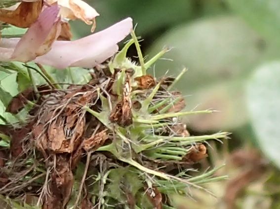 長さ1.3〜1.5センチの紅紫色の蝶形花が球状に集まってつく。