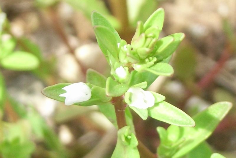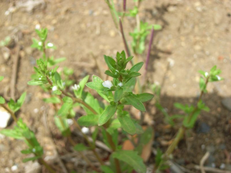 葉腋に直径2〜3ミリでかすかに淡紅色をおびた白い4弁花を1つつける。