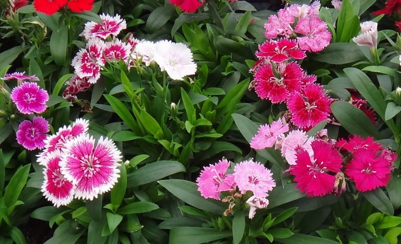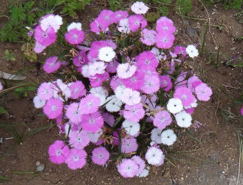 丈は低く、常緑で、5枚の花弁の先が細裂した多彩な花を咲かせる