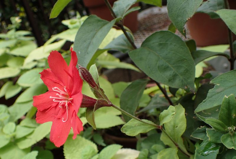 葉は広披針形で対生し、初夏に枝先の集散花序に深紅色の花を咲かせる