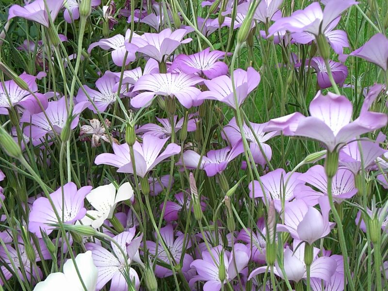 線形〜披針形の葉が対生し、紫桃色で中心が白いものが多い5弁花が咲く