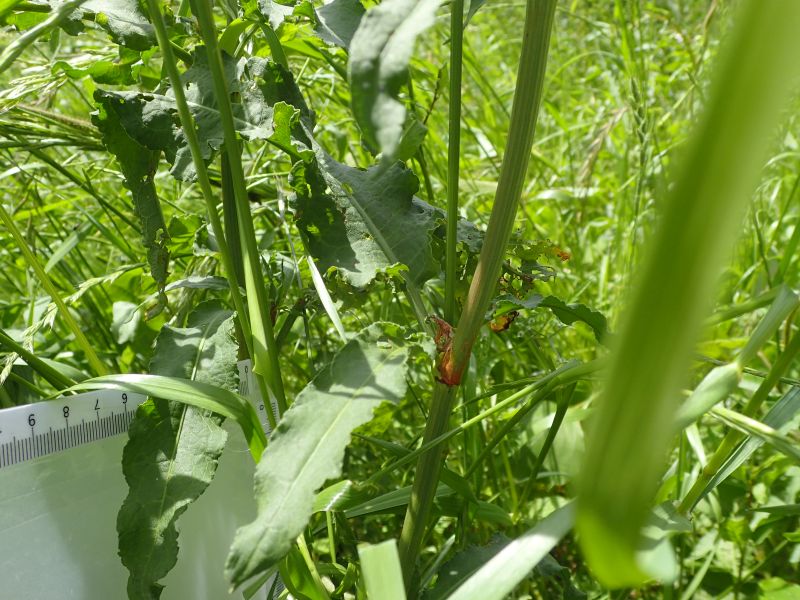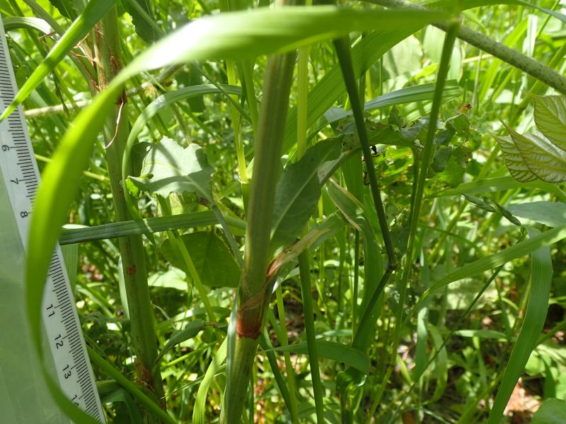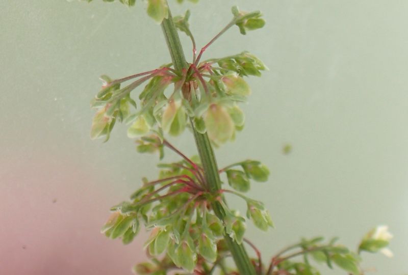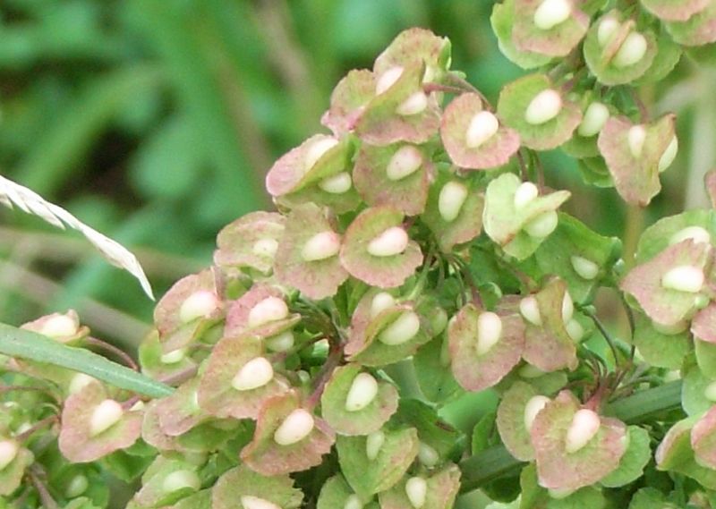 エゾノギシギシ:葉は基部が心形で、ギシギシより幅広で大きく、花穂は黄褐色、そう果の翼に棘がある。