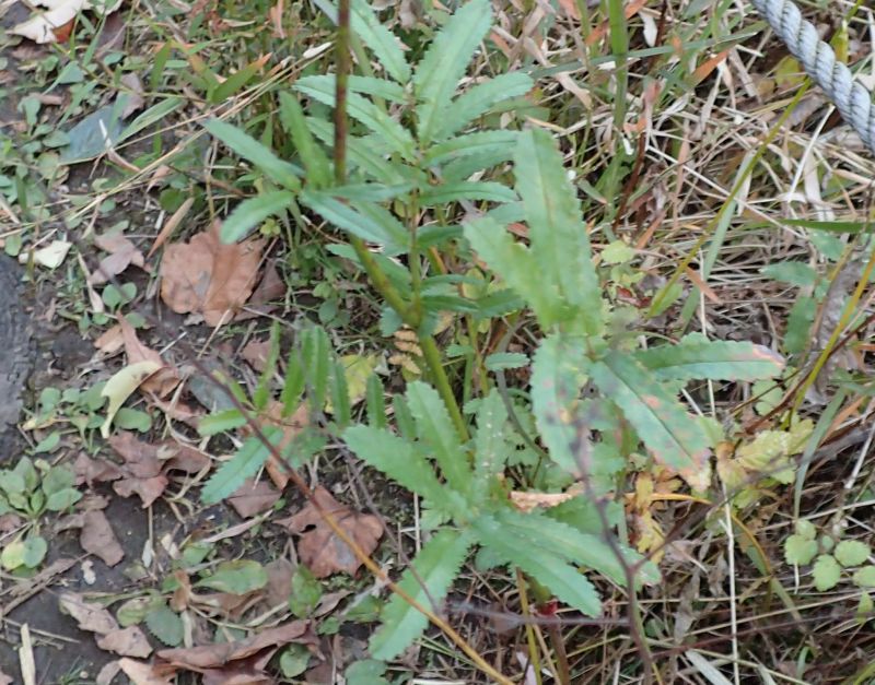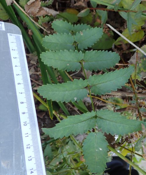 葉は奇数羽状複葉で、小葉は広披針形で鋸歯がある。(2017/11/9)