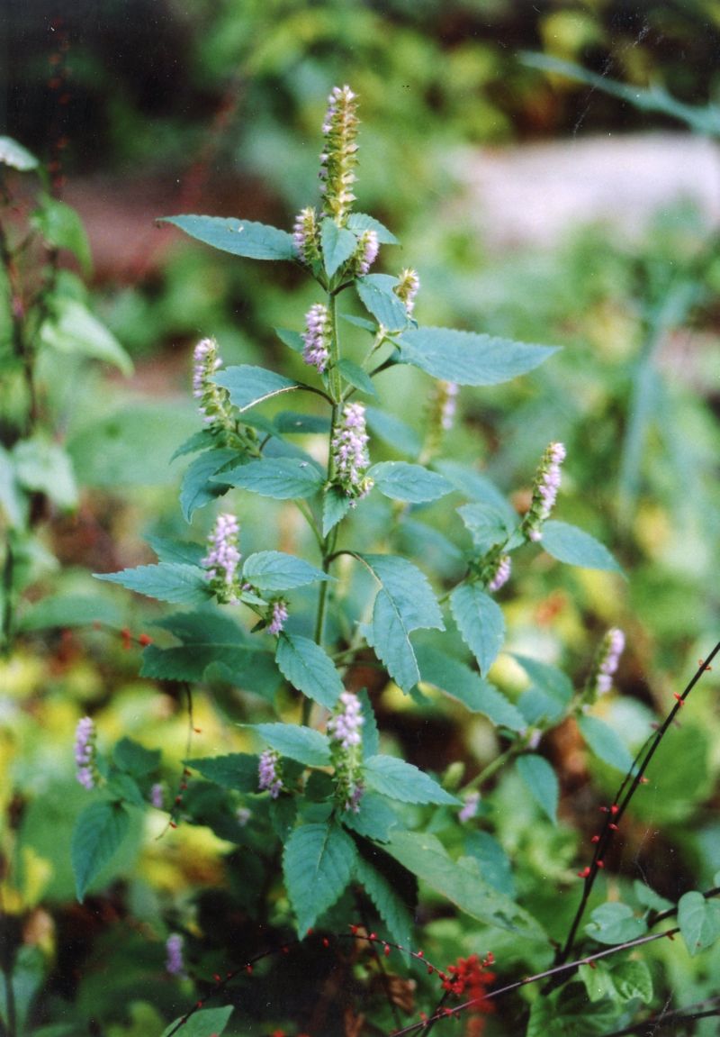 長さ約5ミリの淡紅紫色の唇形花を一方向にそろえて密につける。