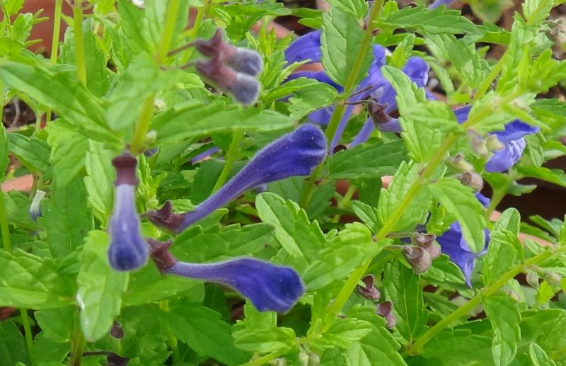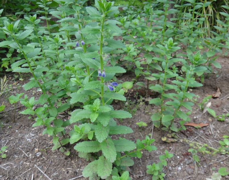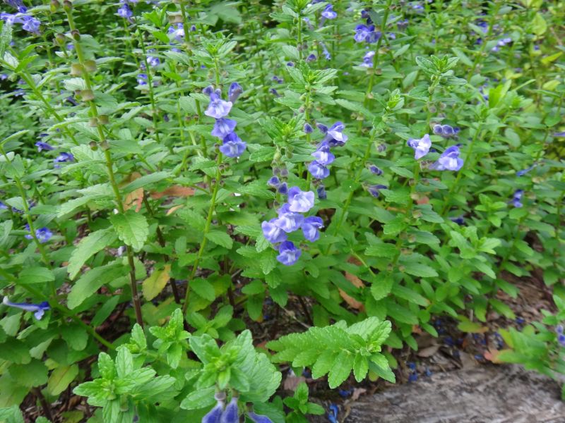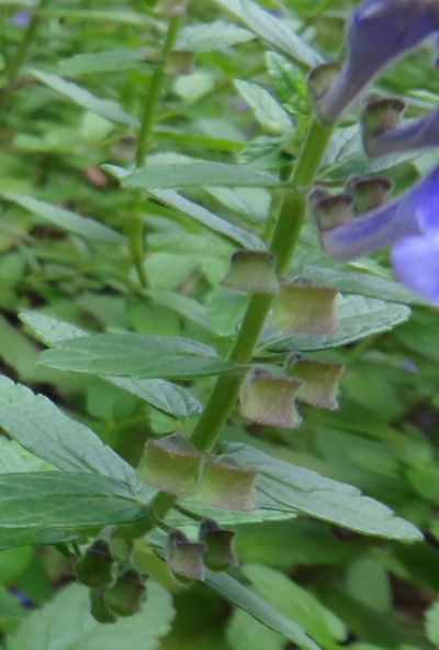 上部の葉腋に青紫色の2つの唇形花を同じ向きにそろえてつける。
