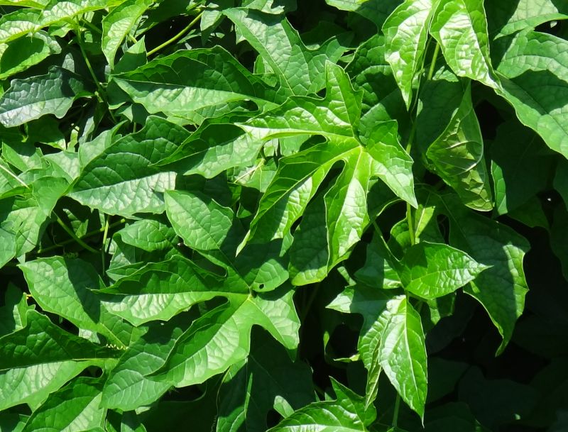 葉は直径約20センチの掌状で、3〜5裂し、互生する。