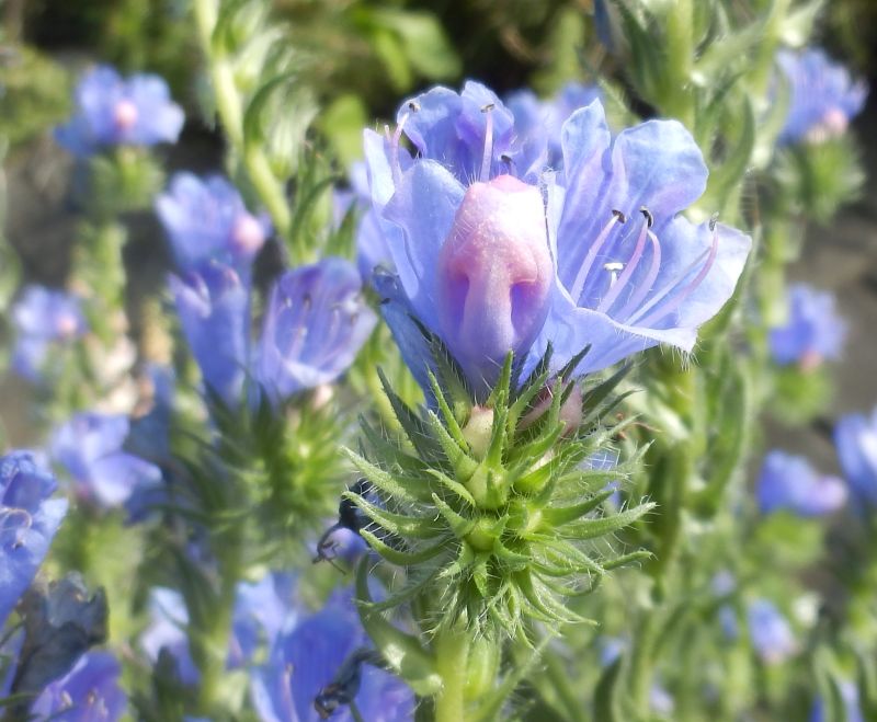 花弁全体が青い花もある。蕾には細毛のある長3角形の萼片が5個ある。