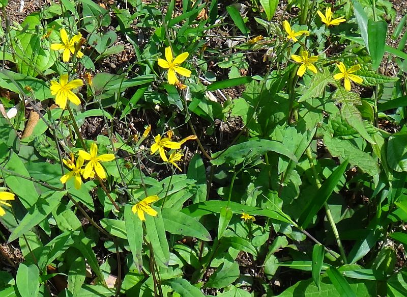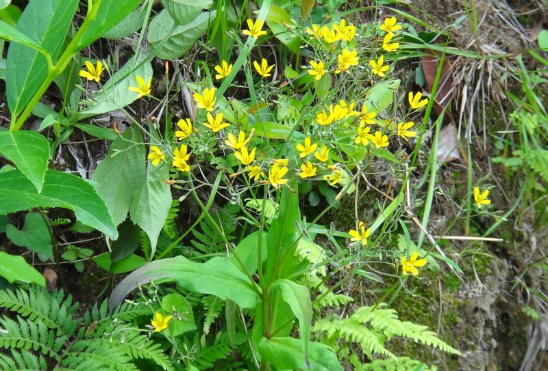 花茎の先に黄色い頭花を数個つける。舌状花は通常5枚で細長く、