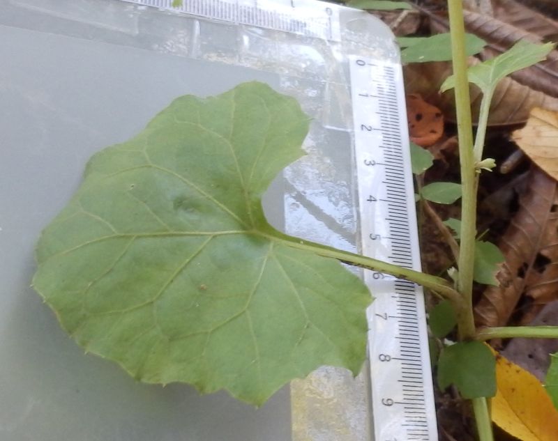 葉は幅10〜20センチの三角状の腎形で、端が所々尖り、