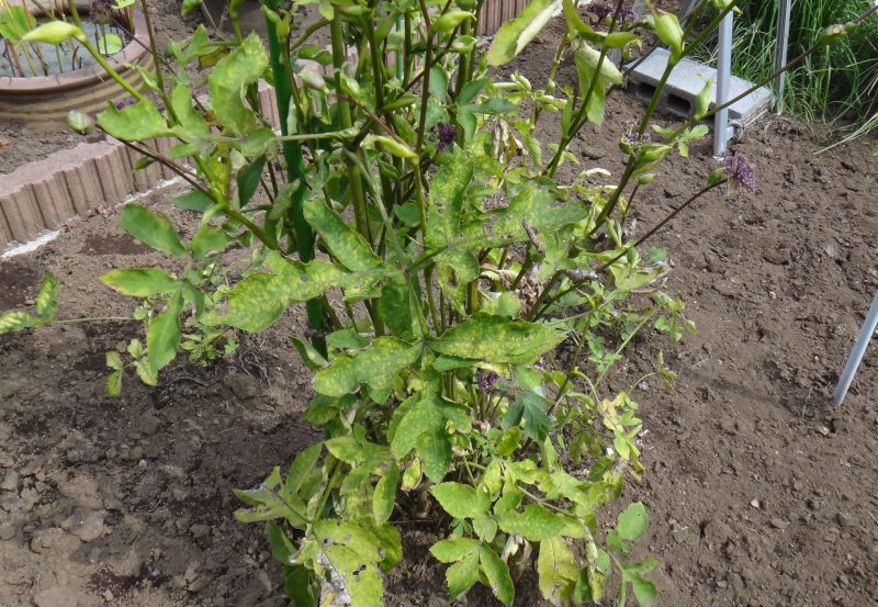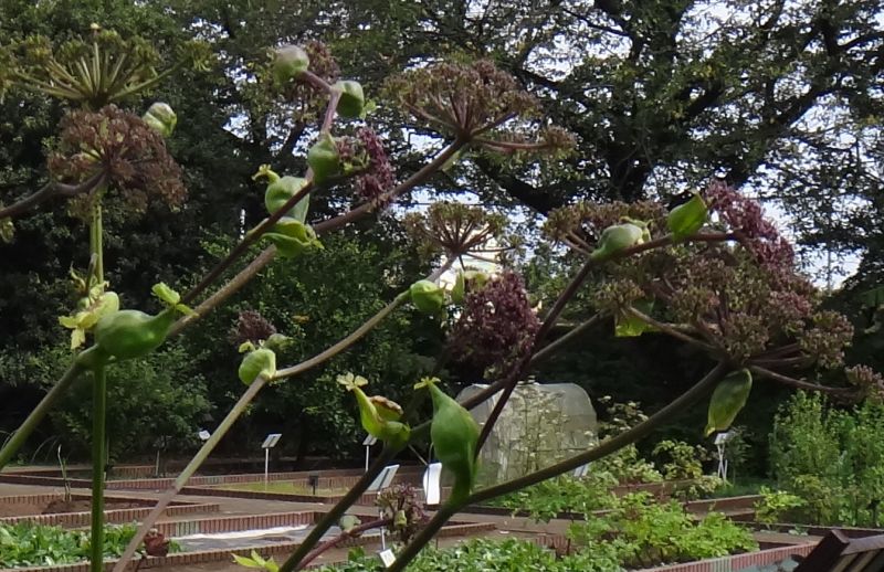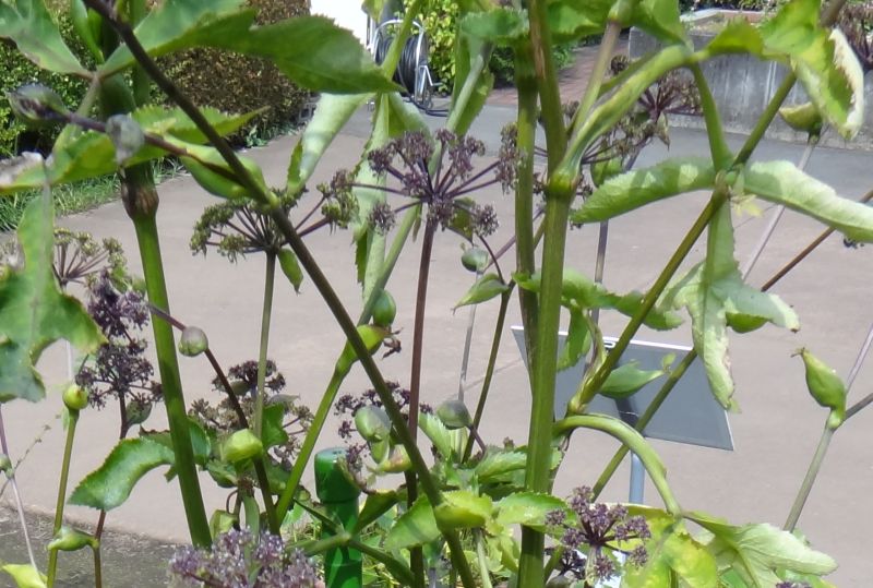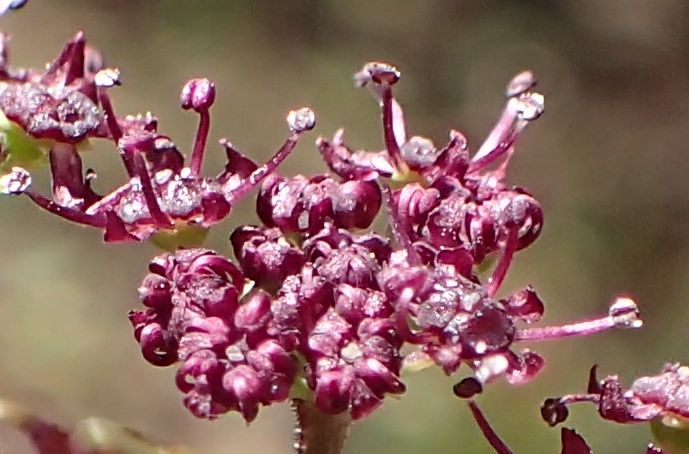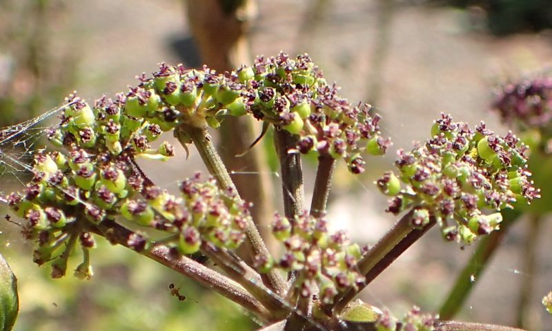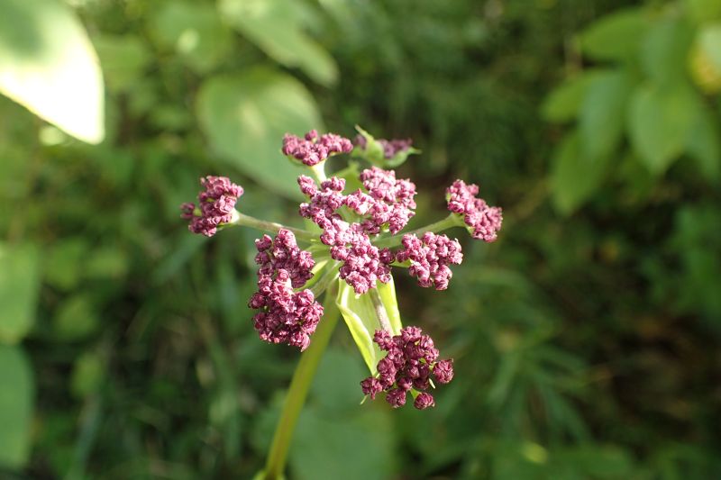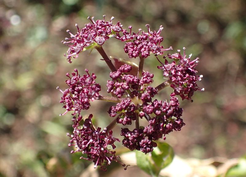 暗紫色の複散形花序が出てきたが、小花はまだ蕾状態。