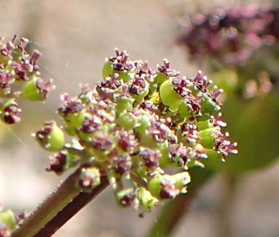 枝先の複散形花序に暗紫色(まれに淡緑白色)の小さい花を多数つける。