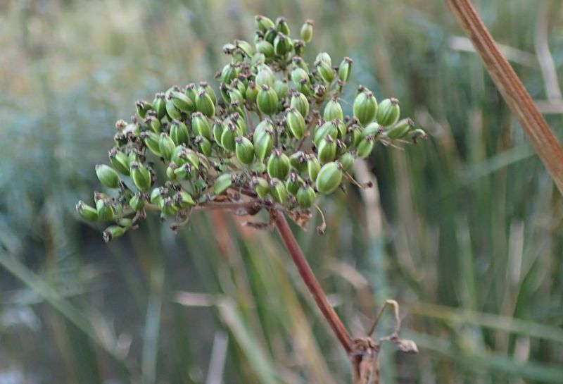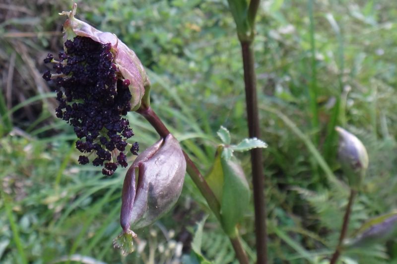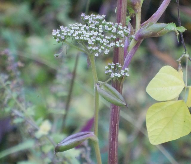 花は暗紫色で、複散形花序の基部に小さな葉のついた葉柄が袋状になってつく。(2015/9/29)