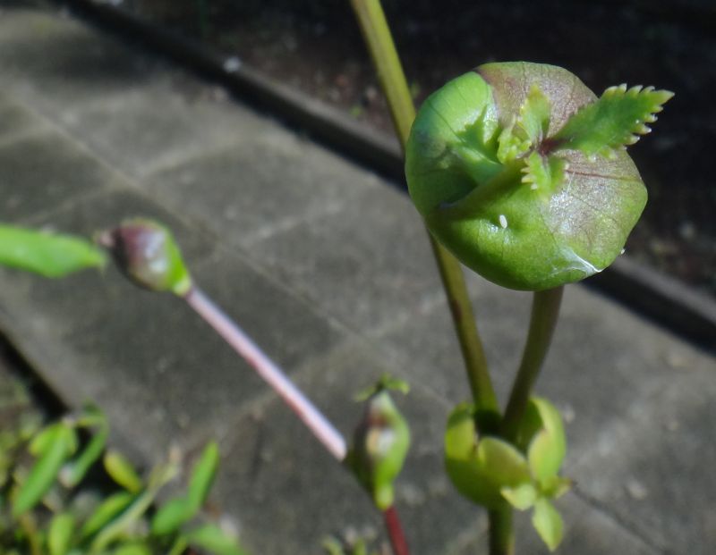 茎の上部では、葉の基部が袋状になって茎を抱く。(2017/8/26)