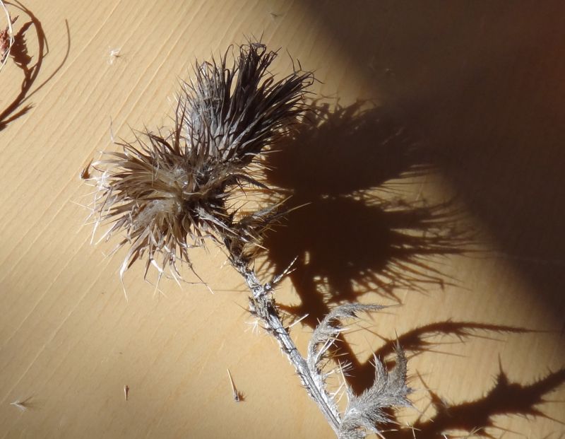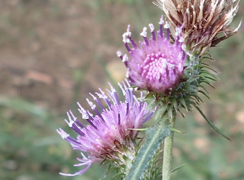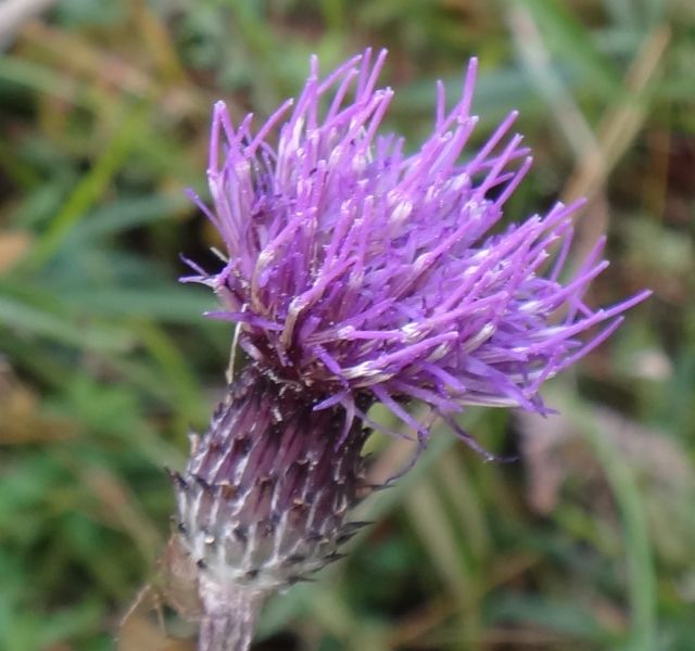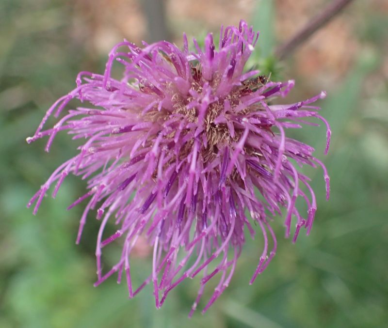 (この花はヒメアザミで、雌しべの先が雄しべの筒からのぞいている。)