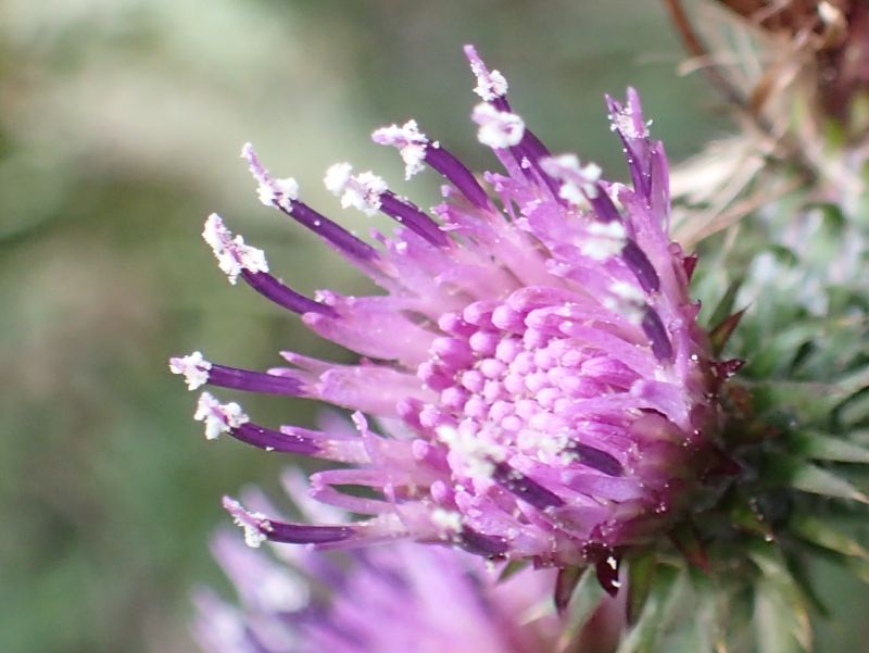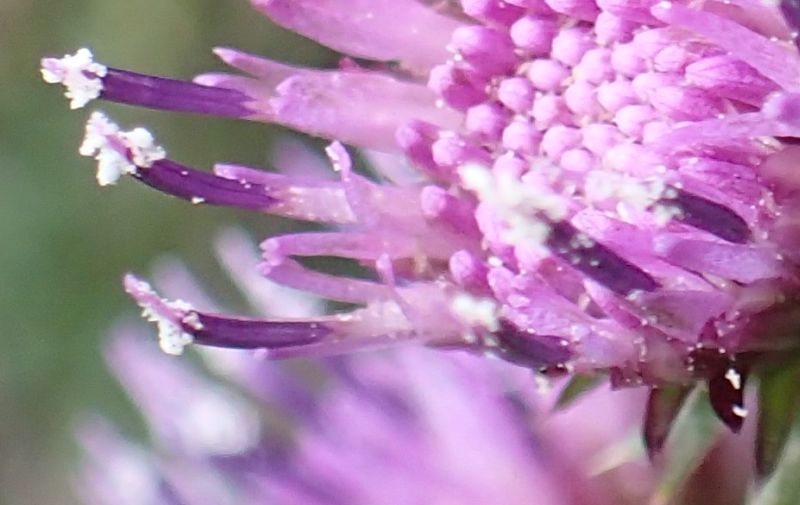 アザミ属の雄しべは濃紫色の筒状で、その中に雌しべが入っている。