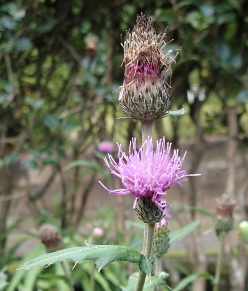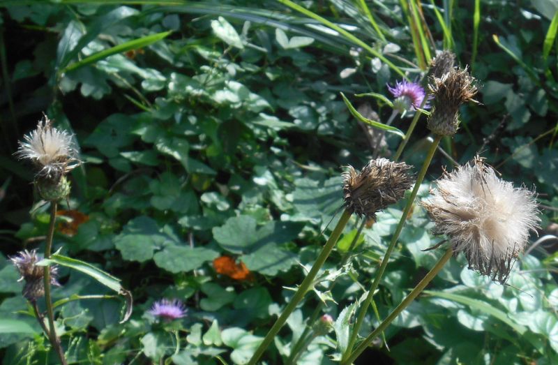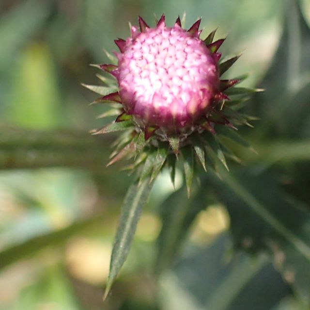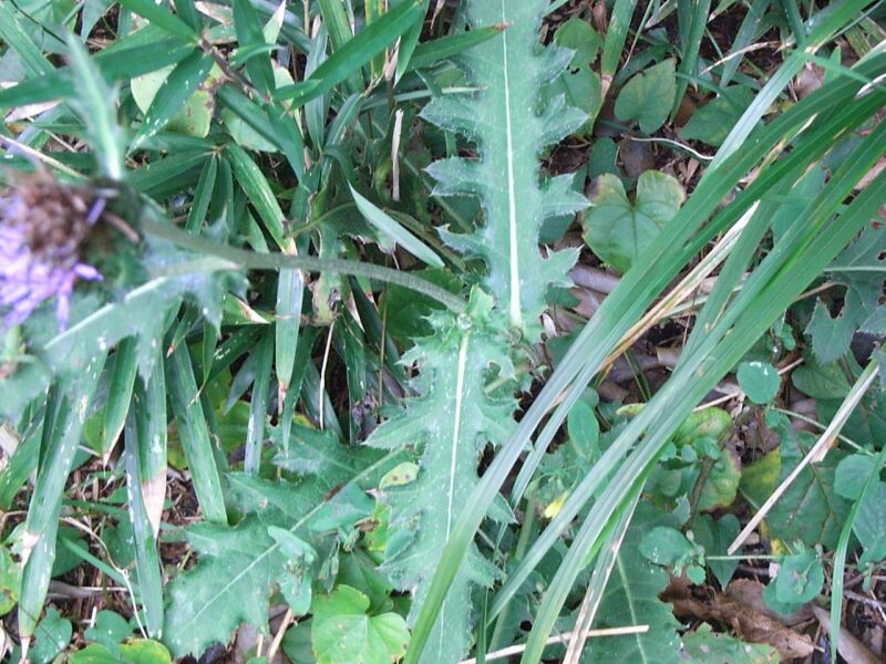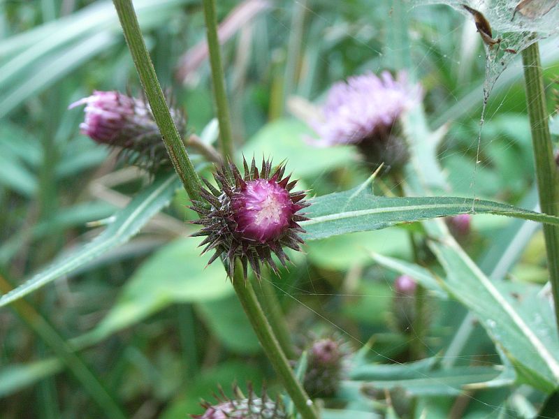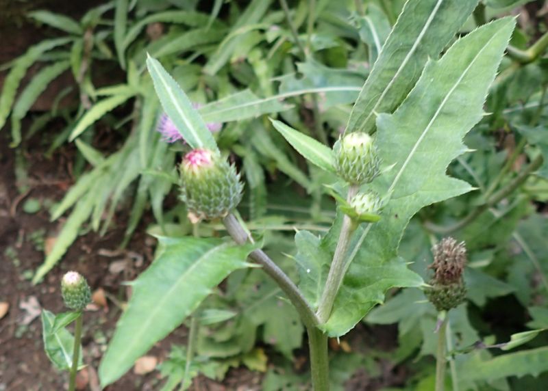 ノアザミ :花期5〜8月、総苞は球形で、総苞片は直立して粘液で粘り、葉は茎を抱く。