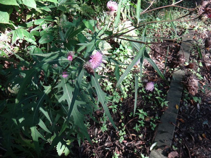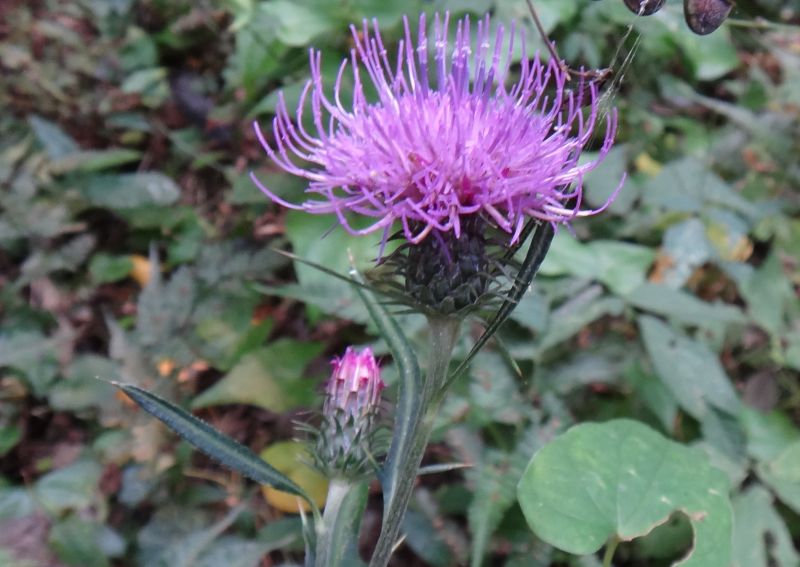 ノハラアザミ:花期8〜10月、総苞は鐘形で、総苞片は斜上して粘らず、葉は茎を抱く。