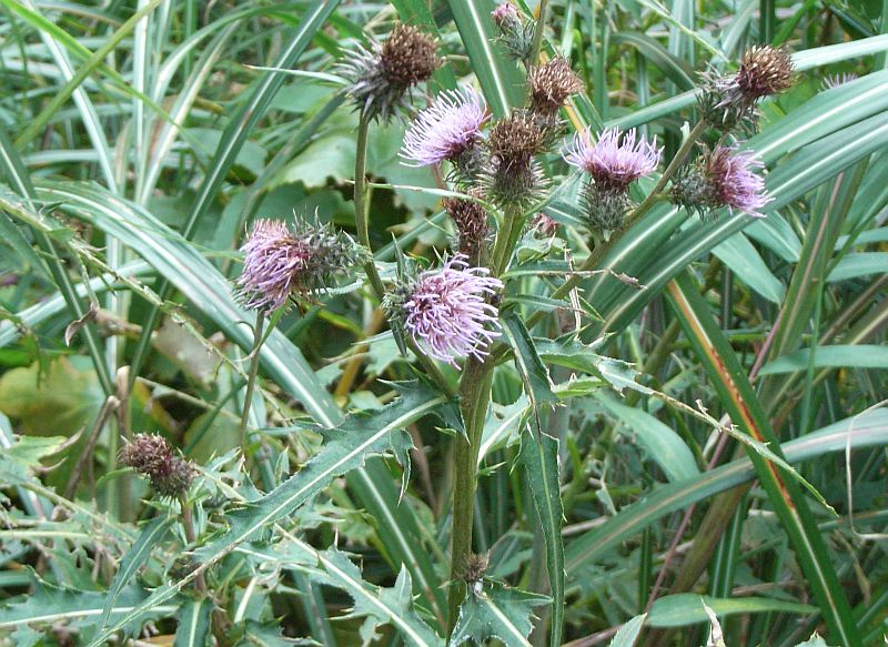 ヒメアザミ :花期8〜10月、総苞は筒形で、総苞片は直立して粘り、葉は茎を抱く。