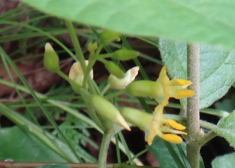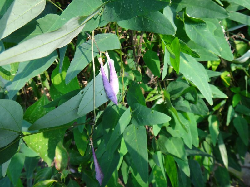 ヤブマメ :葉は広卵形で先尖らず、種子3〜5個、花は束生し紫色、鞘褐熟し縫合部に毛、地下茎にも豆果。