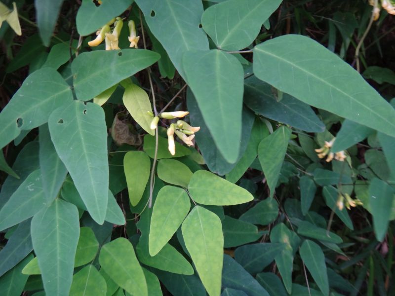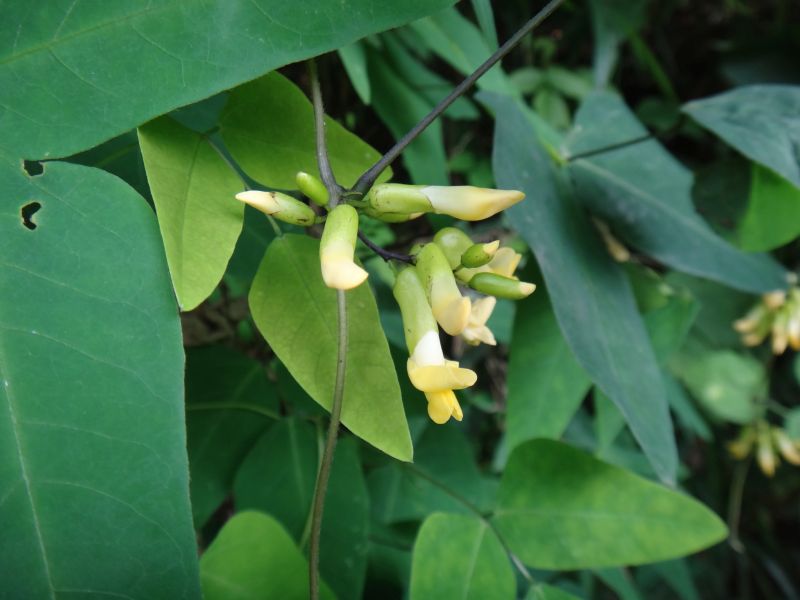 トキリマメ :葉は倒卵形で先尖り後半部が広い、花は総状で黄色、種子2個、鞘赤熟。