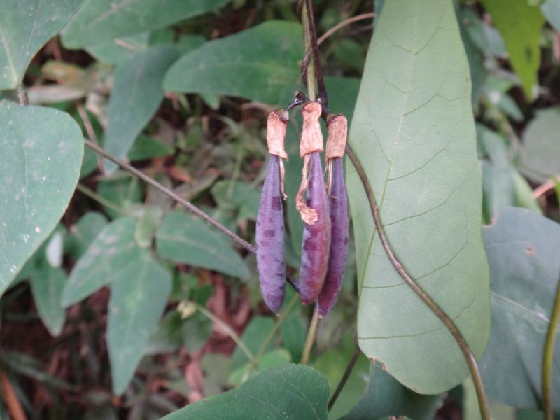 ノササゲ :葉は長卵形で先尖らず前半部が広い、花は総状で黄色、種子3〜5個、鞘紫色。