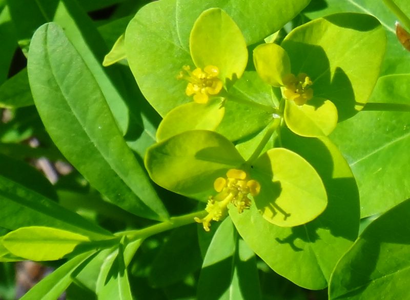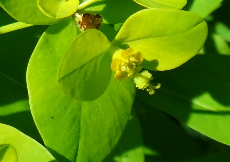 黄色い花弁状のは総苞片の腺体、中心部のツブツブが雄花、突き出して二股になっているのが雌花。(2016/4/15)