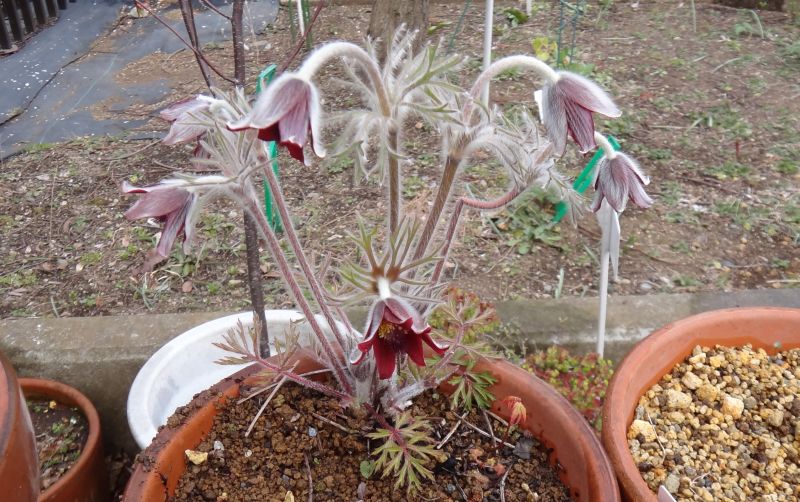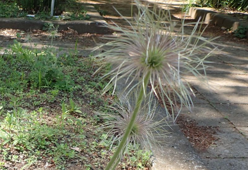 セイヨウオキナグサ:花茎5〜6センチ、花上向き。