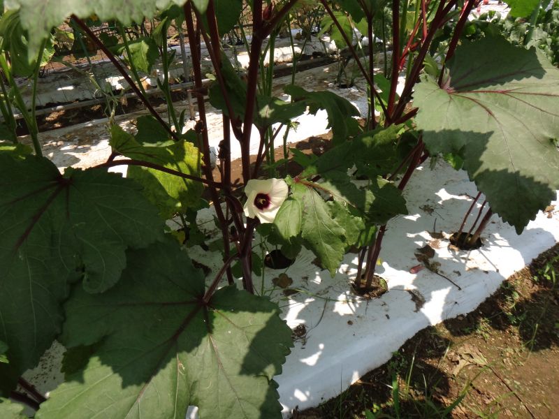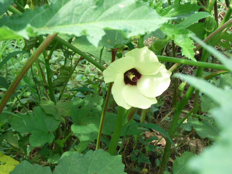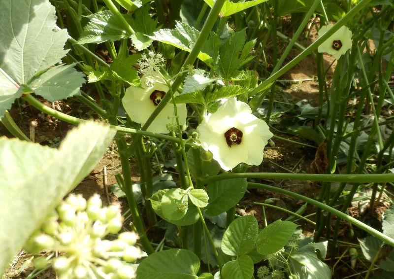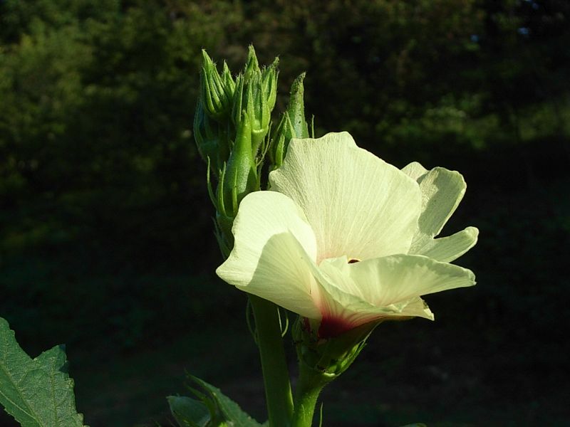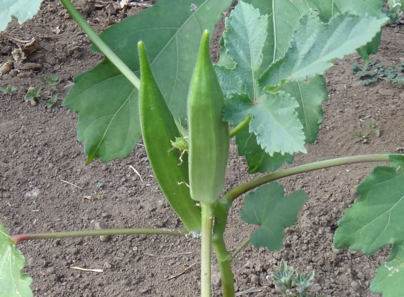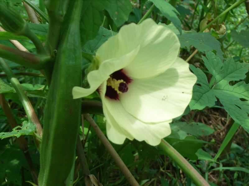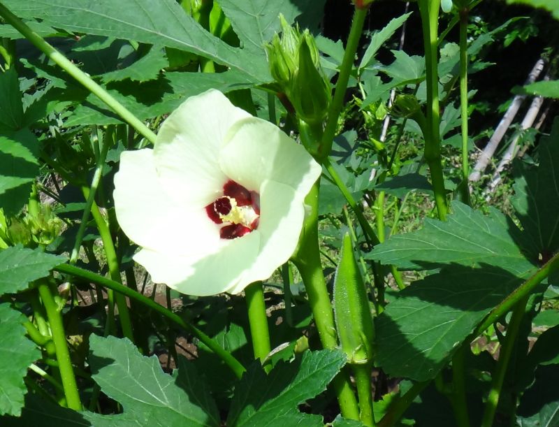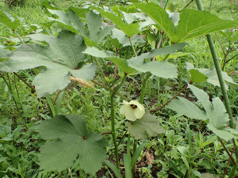 オクラ :葉の裂片は広い、花は半開、果実は角形で柔らかい。