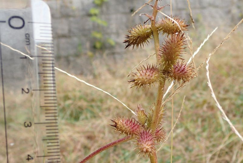 オオオナモミ:高さ0.5〜2メートル、果胞1.8〜2.5センチで多数群がってつく、棘3〜6ミリで密。